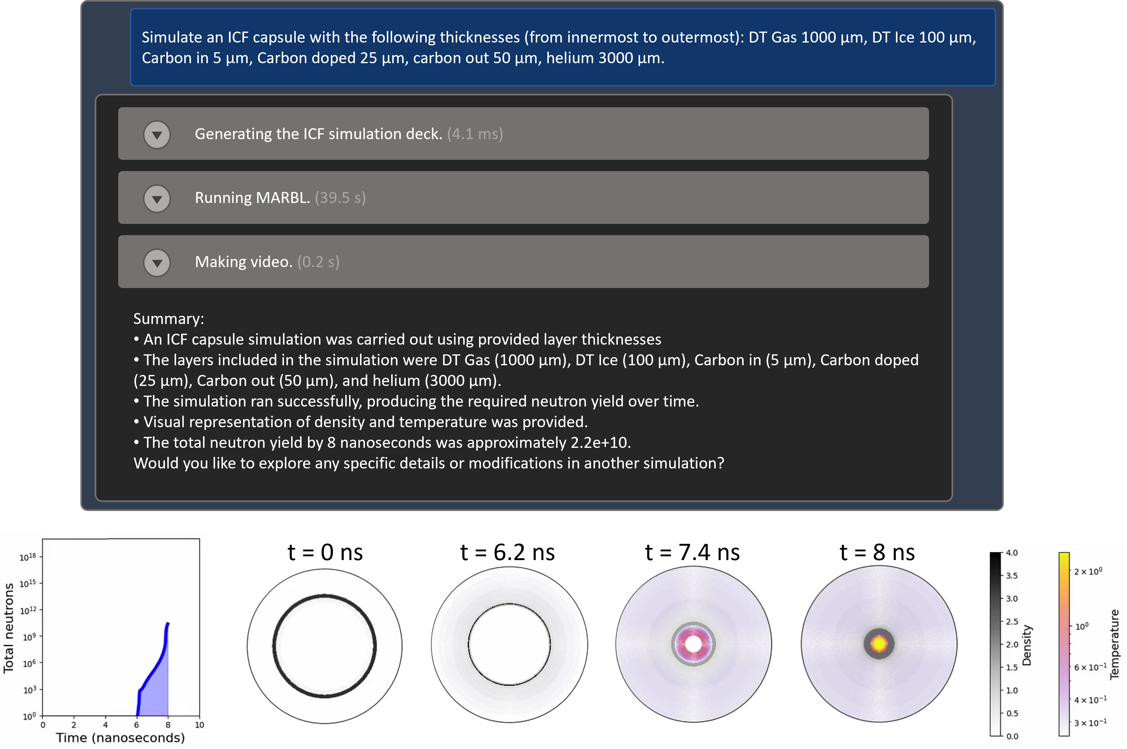 This iterative process is part of the LLNL-led Multi-Agent Design Assistant (MADA) project, which uses AI agents to create a design’s geometry, generate a simulation, summarize the results, and recommend additional solutions. For example, the user could change the thickness of an ICF capsule layer or an ingredient inside it, then ask the model how to increase the capsule’s total energy yield. Jekel noted, “The AI models have their own naïve understanding of complex physics like fusion energy. However, that understanding greatly expands when given the ability to execute our validated multiphysics simulations, which enable the AI systems to hypothesize and reason about why some designs perform better than others.”